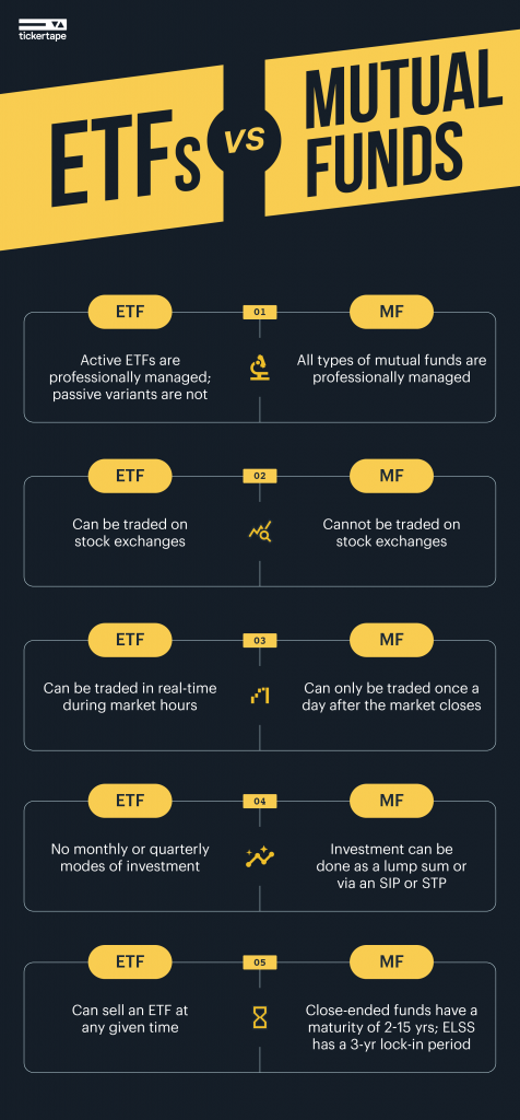 | Systematic investment | There are no monthly or quarterly investment plans for ETF | Investment in a mutual fund can be done as a lump sum or via an SIP or STP |